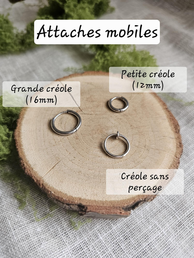 2. Les attaches mobiles permettent de changer les cabochons aux grès de vos envies. Les oreilles non percées ? pas de problème une paire de créoles adaptée est disponible.